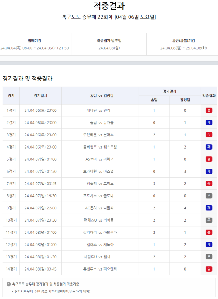 스포츠토토코리아가 지난 6일부터 8일까지 진행된 잉글랜드 프리미어리그(EPL) 7경기 및 이탈리아 프로축구(세리에A) 7경기 등 총 14경기를 대상으로 하는 축구토토 승무패 22회차 게임에서 1등 적중자가 발생하지 않았으며, 이에 따라 1등 적중금 약 6억여원이 23회차로 이월된다고 밝혔다.