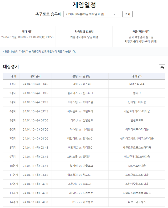 축구토토 승무패 23회차는 지난 7일 오전 8시에 발매를 개시했으며, 오는 9일 오후 9시50분까지 전국 스포츠토토 판매점 및 공식 온라인 발매 사이트 베트맨을 통해 구매가 가능하다.