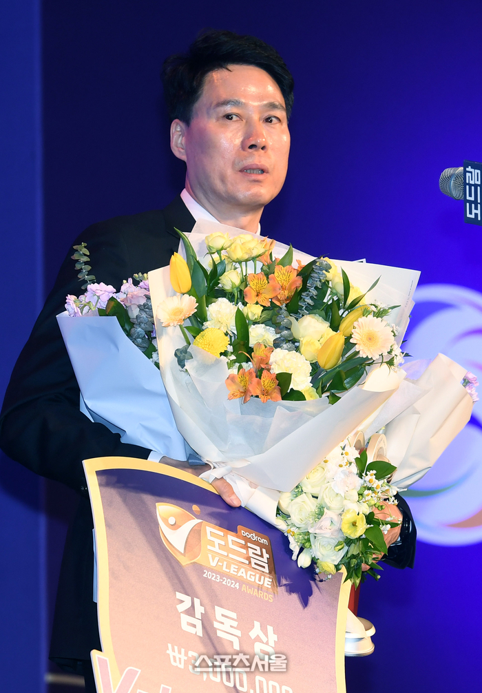 현대건설 강성형 감독이 8일 서울 서초구 더케이호텔에서 진행된 도드람 2023-2024 V-리그 시상식에서 여자부 감독상을 수상한 뒤 소감을 밝히고 있다. 2024. 4. 8. 박진업 기자 upandup@sportsseoul.com