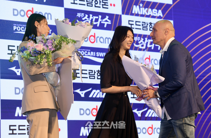 흥국생명 김연경(왼쪽)이 8일 서울 서초구 더케이호텔에서 진행된 도드람 2023-2024 V-리그 시상식에서 여자부 정규리그 MVP로 선정된 뒤 아본단자 감독의 축하를 받고 있다. 2024. 4. 8. 박진업 기자 upandup@sportsseoul.com