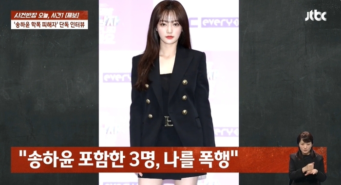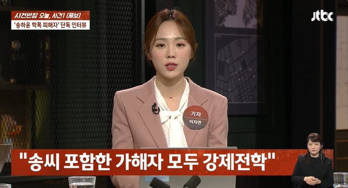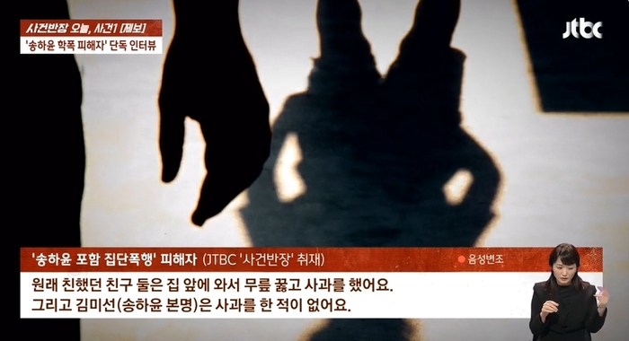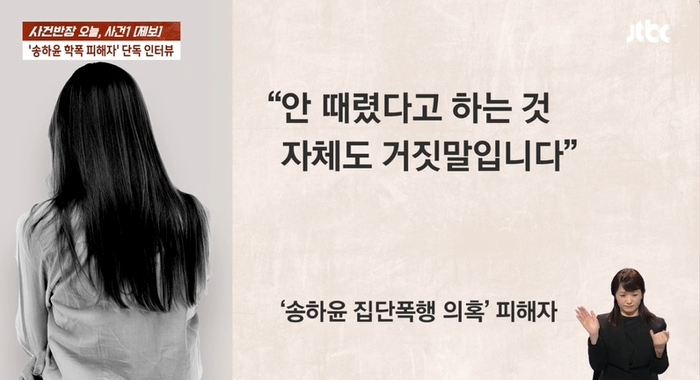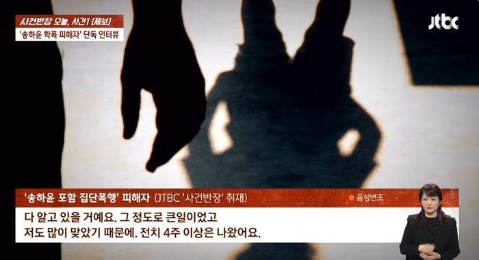 8일 JTBC ‘사건반장’은 배우 송하윤에게 집단 폭행을 당했다고 주장하는 피해자의 단독 인터뷰를 공개했다.