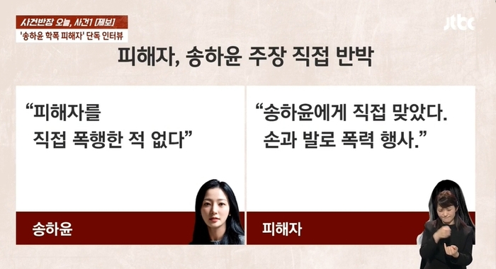 피해자는 송하윤이 ‘직접 때렸냐’는 질문에 “네. 징계위원회랑 강제 전학은 정확하다. 동창들은 다 알고 있을 거다. 그 정도로 큰일이었고 전치 4주 이상 나왔다. 다른 가해자들은 집에 와서 무릎 꿇고 사과했다. 송하윤은 사과한 적이 없다”라고 밝혔다.