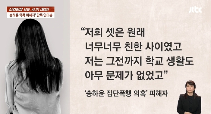 앵커는 “송하윤 소속사에서 집단 폭행의 피해자인 이분의 연락처를 알기 위해서 혈안이 됐었지만 닿지 못했다”라며 밝혔다.