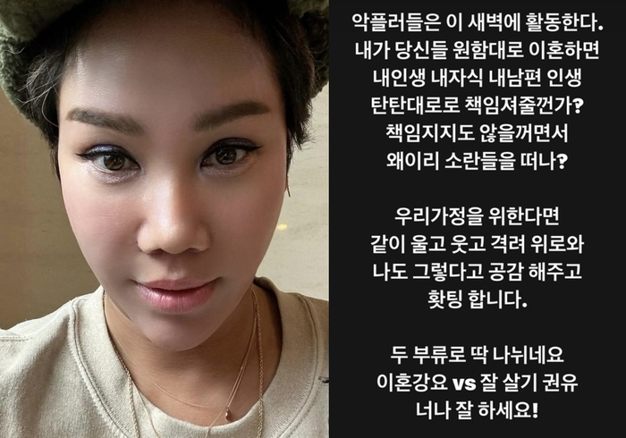 이어 “우리 가정을 위한다면 같이 울고 웃고 격려, 위로와 나도 그렇다고 공감해 주고 파이팅 합니다. 두 부류로 딱 나뉘네요. 이혼 강요 vs 잘 살기 권유. 저는 죽어도 후자이니까요. 나를 위한다는 미명하에 이혼으로 몰지 마시고 너나 잘하세요!”라고 일침을 날렸다.