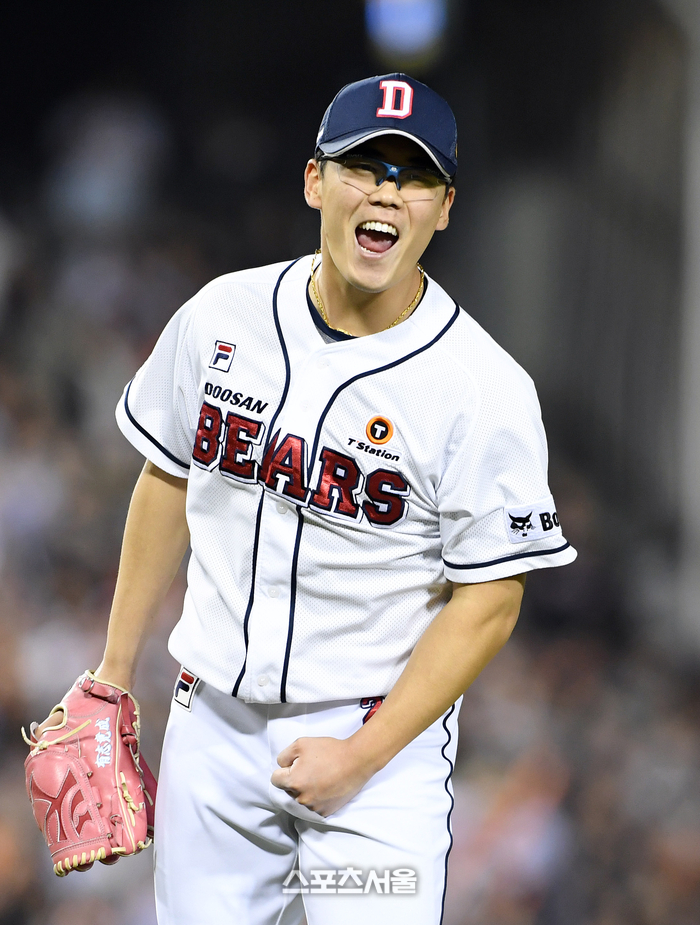 두산 베어스 이병헌이 9일 잠실구장에서 열린 2024 KBO리그 한화 이글스와 경기 6회초 1사 만루 상황에서 한화 페라자를 병살타로 잡아내고 위기를 넘기면서 크게 기뻐하고 있다. 2024. 4. 9. 잠실 | 박진업 기자 upandup@sportsseoul.com