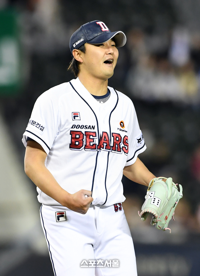 두산 베어스 정철원이 9일 잠실구장에서 열린 2024 KBO리그 한화 이글스와 경기 9회초 2사 1루 상황에서 한화 채은성을 삼진 아웃으로 잡아내고 승리를 지켜내면서 기뻐하고 있다. 정철원은 1이닝을 무실점으로 막아내며 시즌 4세이브를 기록했다. 2024. 4. 9. 잠실 | 박진업 기자 upandup@sportsseoul.com