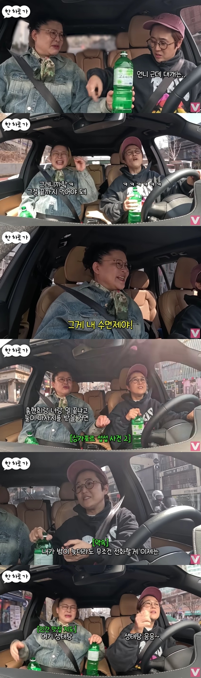 반갑게 송은이의 차에 오른 이영자는 냅다 고로쇠물을 꺼내 폭소를 안겼다. 소주 대병 사이즈의 초록병을 꺼낸 이영자는 송은이와 각 1병을 들고 호방하게 병째 들이키며 “캬. 건강 들어간다. 뭘 먹으려면 속을 비워야지”라고 말해 웃음을 자아냈다.