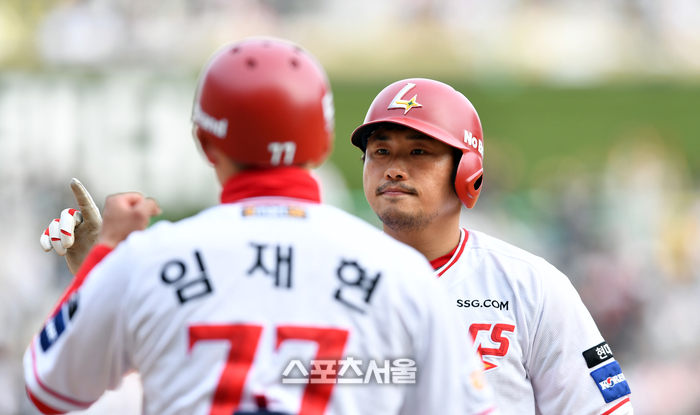 SSG 7번타자 이지영이 10일 인천SSG랜더스플드에서 열린 2024프로야구 SSG랜더스와 키움히어로즈의 경기 7회말 2사 1,2루에서 1타점 적시타를 터트린 후 자축하고 있다. 2024.04.10. 문학 | 강영조기자 kanjo@sportsseoul.com