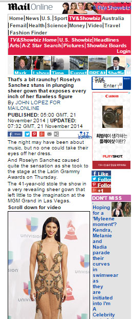 매체에 따르면 20일 제15회 라틴 그래미 어워즈에 참석한 로즐린 산체스는 중요 부위만을 가린 누드톤의 착시 드레스로 시선을 집중시켰다. 그의 완벽한 각선미와 콜라병 몸매를 눈에 띈다.