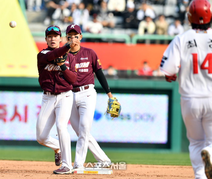 키움 2루수 김혜성이 10일 인천SSG랜더스플드에서 열린 2024프로야구 SSG랜더스와 키움히어로즈의 경기 8회말 1사 만루 SSG 4번 에레디아의 내야땅볼때 병살처리하고 있다. 2024.04.10. 문학 | 강영조기자 kanjo@sportsseoul.com