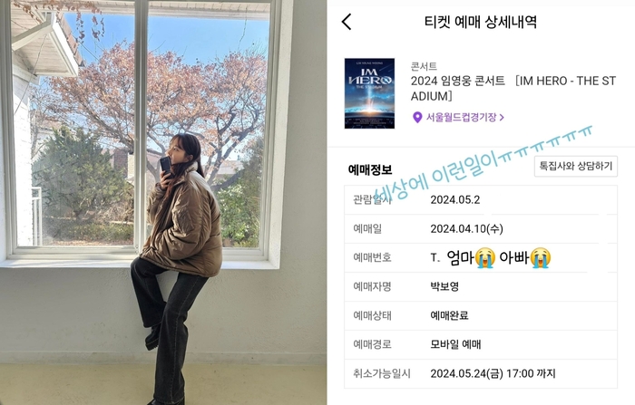 공개한 사진에는 오는 5월 서울 마포구 월드컵경기장에서 열리는 임영웅 콘서트 ‘더 스태디움’ 두 자리 티켓팅에 성공한 박보영의 예매 내역이 담겼다.
