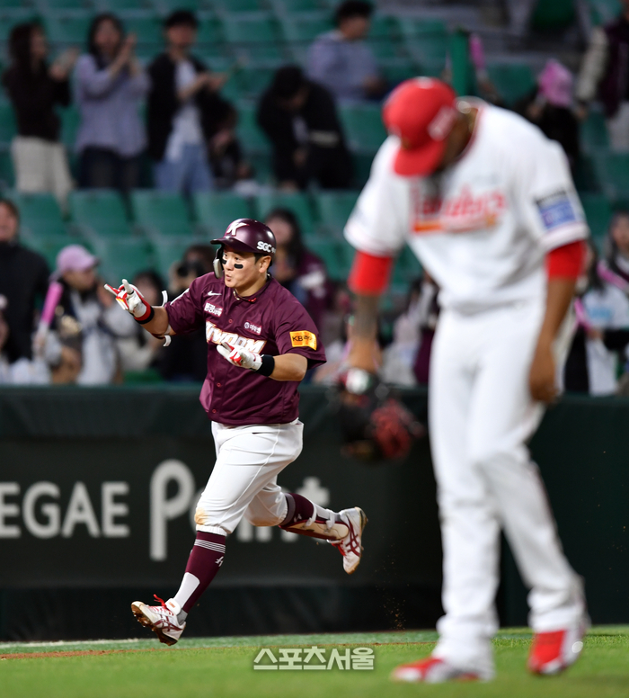 키움 4번타자 최주환이 11일 인천SSG랜더스필드에서 열린 2024프로야구 SSG랜더스와 키움히어로즈의 경기 3회초 투런홈런을 터트리고 홈인하고 있다. 2024.04.11. 문학 | 강영조기자 kanjo@sportsseoul.com