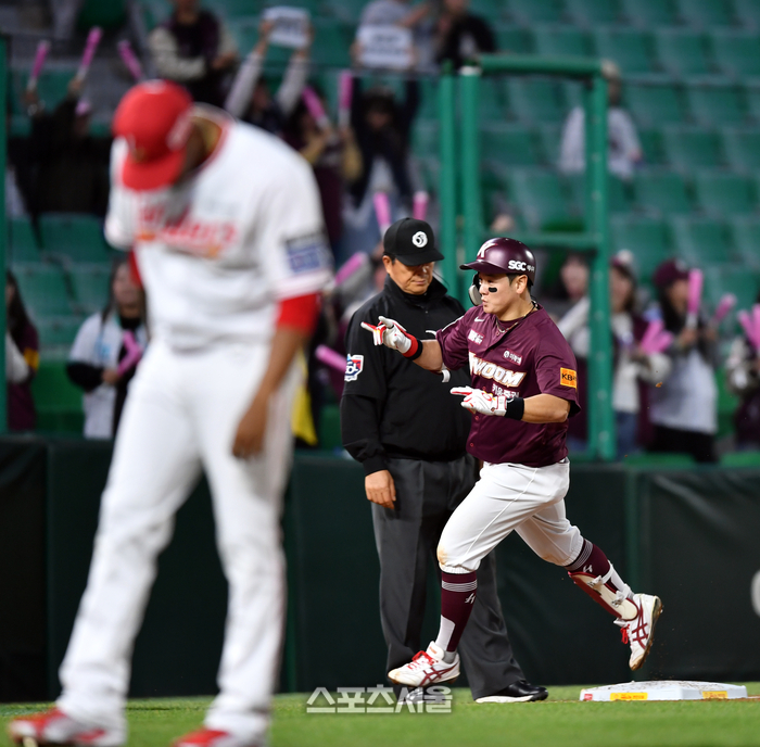 키움 4번타자 최주환이 11일 인천SSG랜더스필드에서 열린 2024프로야구 SSG랜더스와 키움히어로즈의 경기 3회초 투런홈런을 터트리고 홈인하고 있다. 2024.04.11. 문학 | 강영조기자 kanjo@sportsseoul.com