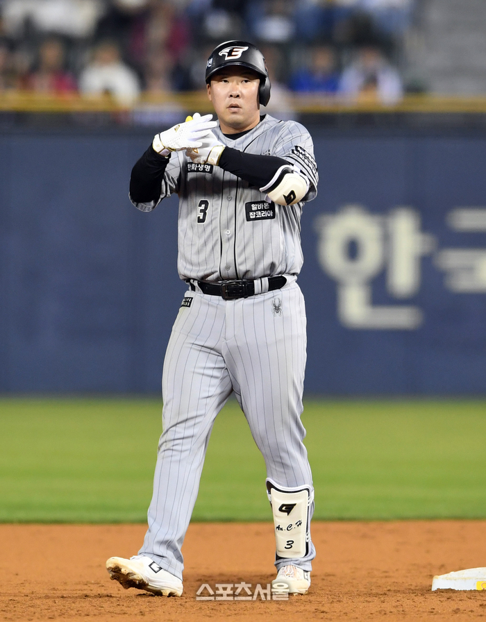 한화 이글스 안치홍이 11일 잠실구장에서 열린 2024 KBO리그 두산 베어스와 경기 4회초 무사 1루 상황에서 두산 선발 브랜든을 상대로 1타점 2루타를 치고 세리머니를 하고 있다. 2024. 4. 11. 잠실 | 박진업 기자 upandup@sportsseoul.com