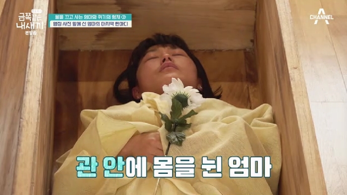 부부는 오박사의 제안에 따라 임종 체험을 하기 위해 절로 향했다. 영정 사진 속의 자신을 발견한 엄마는 수의를 입고 관에 들어가는 것까지 체험했다. 관에 앉은 엄마는 “무섭다. 계속 아이들이 눈에 밟힌다. 애들 입장에서 생각 안 해주고 존중해주지 않은 것 같다. 이기적으로 산 것 같다”라며 지난 시간을 떠올렸다.