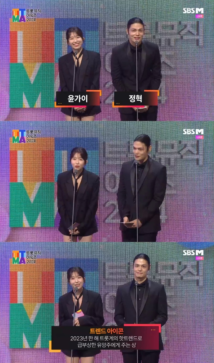 윤가이는 “앞에 장윤정 선배님, 김호중 선배님도 계시는데 너무 떨리고 눈과 마음을 어디에 둬야 할지 모르겠다”고 솔직한 소감을 밝혔다. 이어 “한 해 동안 우리 트롯계의 트렌드를 이끈 아주 핫한 분들이다. 트렌드아이콘 수상자를 만나보겠다”라고 소개한 뒤 안성훈, 홍지윤, 양지은을 호명했다.