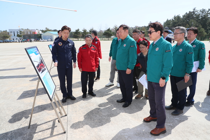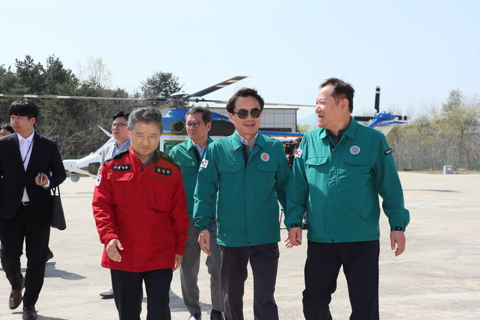 김진태 강원지사와 이상민 장관은 산림청 소속의 강릉산림항공관리소로 이동해 산불 진화 헬기 운영상황과 출동태세 등을 점검하였고, 신속한 산불 진화를 위해 애쓰고 있는 산불 진화대원과 헬기 대원을 격려했다.