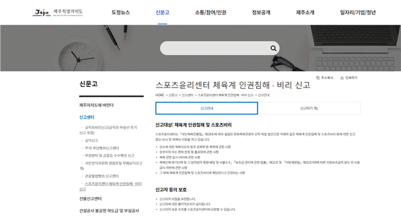 [스포츠서울 | 이웅희 기자] 문화체육관광부 산하 스포츠윤리센터가 스포츠인권 사각지대 해소 일환으로 4월 제주도청·제주교육청 각 홈페이지 신문고, 신고/청렴(신고센터)란에 신고 창구를 개설, 운영하기로 했다.
