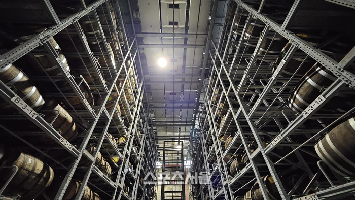 철제 계단을 따라 깊이 내려가다 보니 거대한 목통(오크통)이 빼곡하게 쌓여 있었다. 창고 내부 온도는 10.2℃, 습도는 79.9%도로 냉기와 함께 나무 향과 짙은 술향이 가득했다.