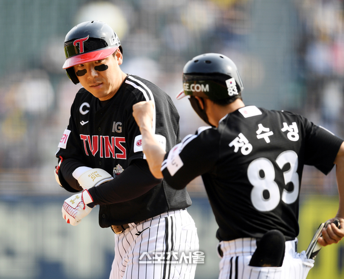 LG 김현수가 14일 잠실야구장에서 열린 2024 KBO리그 두산과 경기 5회초 1사 우전안타를 친 후 정수성 코치와 하이파이브를 하고 있다. 2024. 4. 14. 잠실 | 최승섭기자 thunder@sportsseoul.com