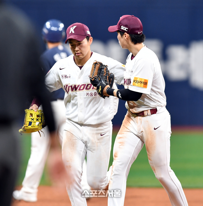 키움 김휘집이 14일 고척스카이동에서 열린 2024프로야구 키움히어로즈와 롯데자이언츠의 경기 6회초 1사 만루 롯데 유강남의 잘맞은 타구를 잡아내며 병살로 연결시킨 후 2루수 김혜성의 축하를 받고 있다. 2024.04.14. 고척 | 강영조기자 kanjo@sportsseoul.com