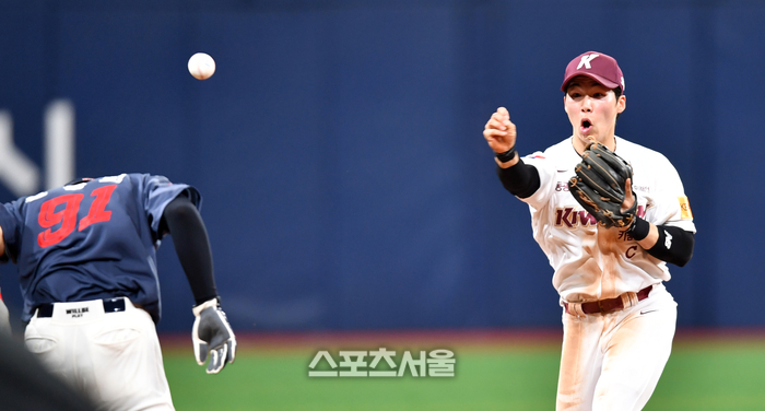 키움 2루수 김혜성이 14일 고척스카이동에서 열린 2024프로야구 키움히어로즈와 롯데자이언츠의 경기 7회초 1사 1루 롯데 3번타자 레이예스 땅볼때 1루주자 윤동희를 2루포스아웃시킨후 1루로 던져 이닝을 끝내고 있다. 2024.04.14. 고척 | 강영조기자 kanjo@sportsseoul.com