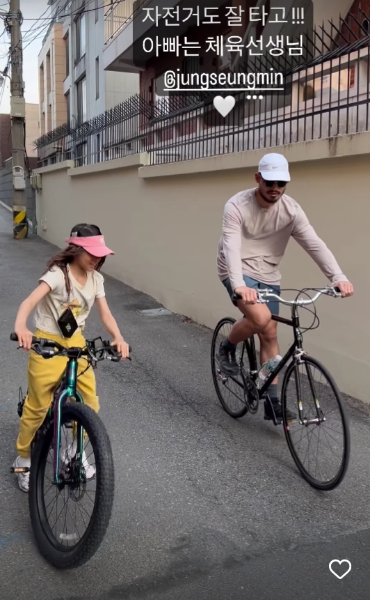 장윤주는 14일 자신의 채널에 함께 자전거를 타는 남편과 딸의 영상을 올렸다. 장윤주의 딸 리사는 핑크 선캡에 민트색 선글라스, 까만 미니백까지 착용한 채 자못 진지한 표정으로 자전거를 타는 모습. 그의 곁에는 하얀 스냅백 모자를 쓴 아빠가 함께 했다.