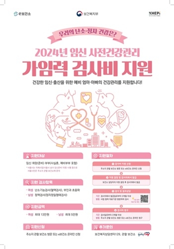 지원 대상은 임신을 희망하거나 계획하고 있는 부부(사실혼, 예비부부 포함)다. 온라인(e보건소) 또는 주소지 보건소로 구비서류를 갖춰 사전 신청 후 발급받은 검사의뢰서를 의료기관에 제출하고 검사를 받으면 된다.
