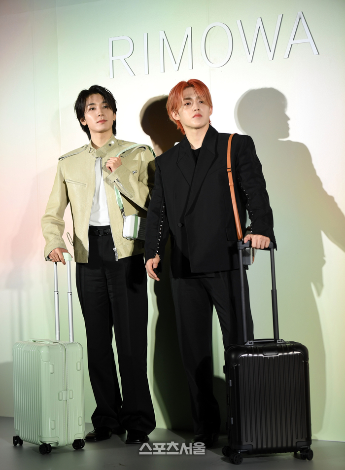 세븐틴 원우(왼쪽), 에스쿱스가 15일 서울 성수동 에스팩토리 D동에서 열린 리모와(RIMOWA) 포토콜행사에서 포토타임을 갖고 있다. 2024. 4. 15. 최승섭기자 thunder@sportsseoul.com