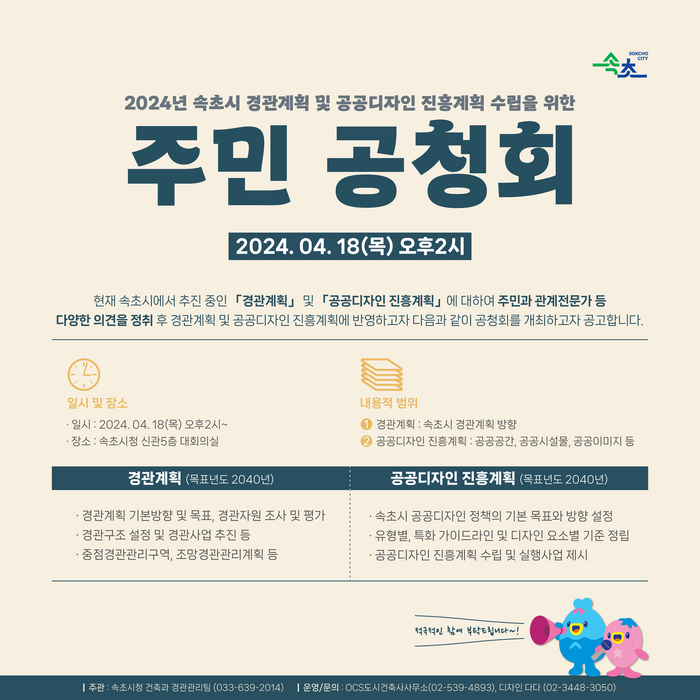 본 공청회는 2023년 4월 용역 착수보고 이후 그동안 진행된 용역 결과를 보고하는 자리로, 광역교통 여건의 변화 등 계속하여 성장하는 도시에 발맞춰‘누구나 함께하고 언제나 머물 수 있는 속초 나들이’를 주제로 경관·공공디자인 계획과 방안, 실행사업과 가이드라인 등 구체적인 요소들을 설명할 예정이다.
