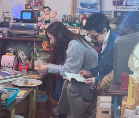 사진에는 옆에 앉은 강수지를 위해 양산을 들어주는 김국진의 모습과 나란히 소파에 앉아 책을 보는 모습도 담겼다.