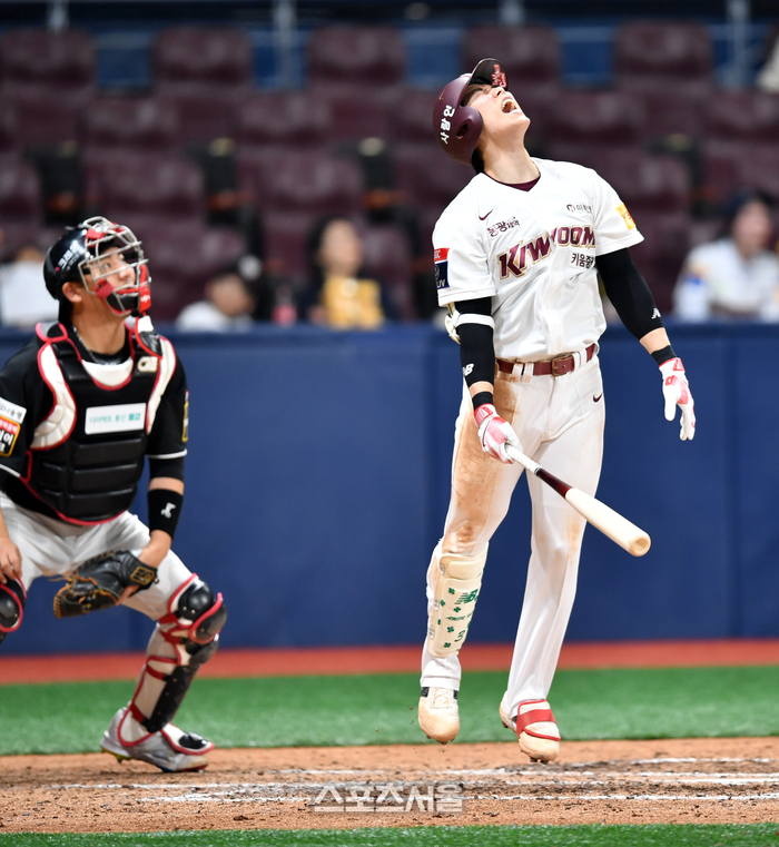 키움 3번타자 김혜성이 16일 고척스카이돔에서 열린 2024프로야구 키움히어로즈와 KT위즈의 경기 7회말 1루에서 외야플라이를 치고 아쉬움을 터트리고 있다. 2024.04.16. 고척 | 강영조기자 kanjo@sportsseoul.com