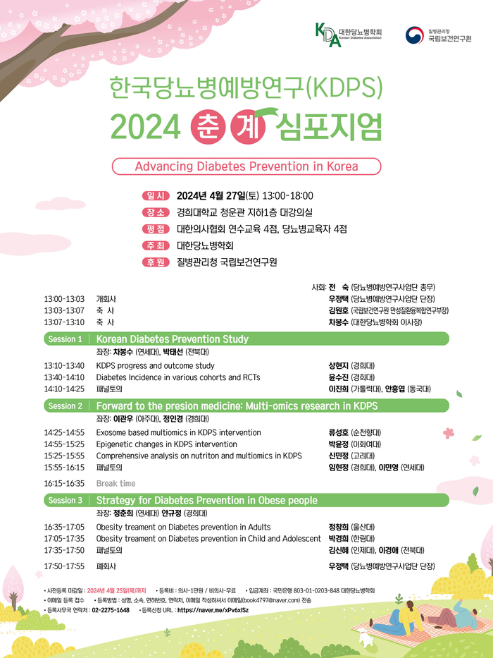대한당뇨병학회가 주최하고 질병관리청 국립보건연구원이 후원하는 이번 심포지엄은 총 3개의 세션으로 진행된다. 한국당뇨병예방연구사업의 성과, 정밀의학을 위한 멀티오믹스 연구, 비만인의 당뇨병 예방을 위한 전략 등이다. 경희대병원을 비롯해 총 12개 병원의 교수진이 좌장 및 연사로 나선다.