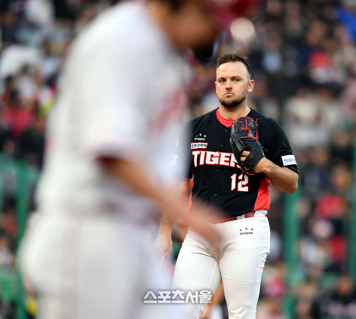KIA 선발투수 크로우가 17일 인천 SSG랜더스필드에서 열린 2024 KBO리그 SSG와 경기 1회말 2사 투구에 맞은 상대 최정을 바라보고 있다. 2024. 4. 17. 문학 | 최승섭기자 thunder@sportsseoul.com