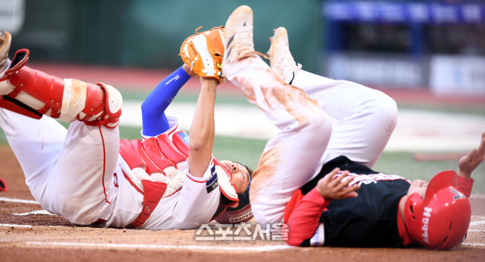 KIA 이우성이 17일 인천 SSG랜더스필드에서 열린 2024 KBO리그 SSG와 경기 1회초 무사2,3루 최형우 중전안타 때 홈으로 파고들었으나 아웃되고 있다. 상대 포수는 이지영. 2024. 4. 17. 문학 | 최승섭기자 thunder@sportsseoul.co