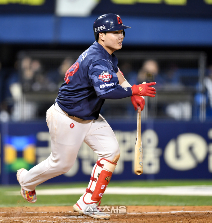 롯데 9번타자 정보근이 17일 잠실구장에서 열린 2024프로야구 LG트윈스와 롯데자이언츠의 경기 8회초 2사 1루에서 안타로 출루하고 있다. 2024.04.17. 잠실 | 강영조기자 kanjo@sportsseoul.com