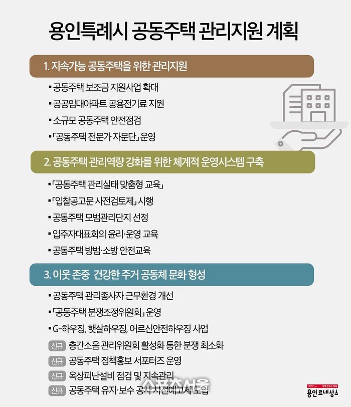 이상일 시장은 “공동주택 공용시설을 보수할 경우 시가 보조금 지원을 확대하는 등 공동주택 단지에 필요한 맞춤형 관리지원을 하는 공동주택관리 지원 종합계획을 시행하는 것은 보다 안전하고 쾌적한 공동주택을 만들고 입주민 입장에서 잘 관리되도록 하겠다는 것을 의미한다”고 말했다.