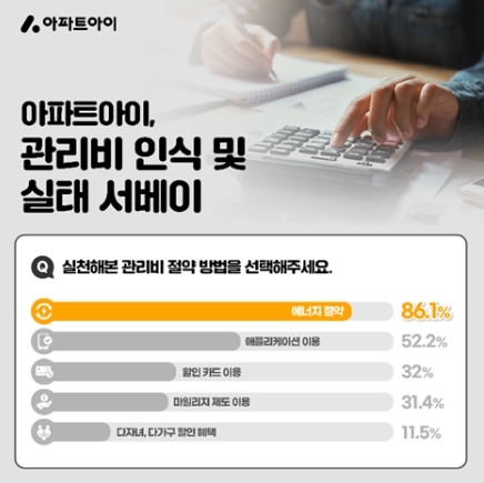 또한 응답자 93.1%가 관리비 절약을 위해 어떠한 노력을 했다고 응답했다. 이중 86%가 전기·가스 등 에너지 절약을 가장 많이 꼽았고, 52.2%는 아파트 관리 앱을 이용해 관리비 지출을 줄였다고 답했다.