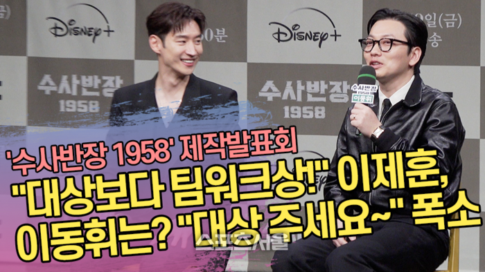 ‘수사반장 1958’을 통해 첫 MBC 드라마에 출연하는 이제훈은 연기 대상 욕심에 대해 “대상보다 팀워크 상을 받고 싶다”고 말했다. 옆에서 듣던 이동휘는 “나는 무조건 대상”이라며 “전에 MBC 시상식에 왔다가 빈손으로 돌아간 적이 있다. 뭐든 주시면 감사히 받아가겠다”고 말해 웃음을 자아냈다.