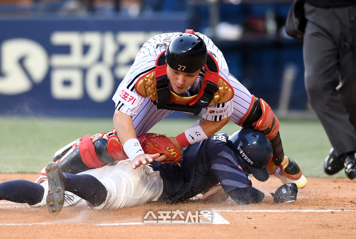 롯데 자이언츠 황성빈(아래)이 18일 잠실구장에서 열린 2024 KBO리그 LG 트윈스와 경기 3회초 1사 2루 상황에서 레이예스의 내야 안타 때 2루에서 홈까지 파고들어 득점을 하고 있다. LG 포수는 박동원. 2024. 4. 18. 잠실 | 박진업 기자 upandup@sportsseoul.com