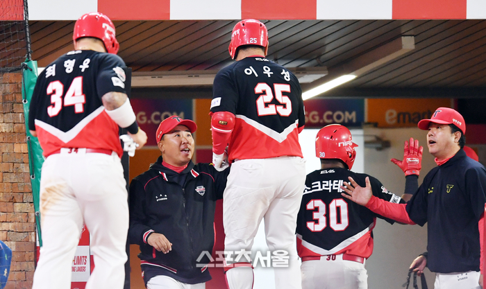 KIA 6번타자 이우성이 18일 인천SSG랜더스필드에서 열린 2024프로야구 SSG랜더스와 KIA타이거즈의 경기 6회초 1사 2,3루에서 조병현을 상대로 좌월3점홈런을 터트리고 홈인하고 있다. 축하하는 이범호 감독. 2024.04.18. 문학 | 강영조기자 kanjo@sportsseoul.com