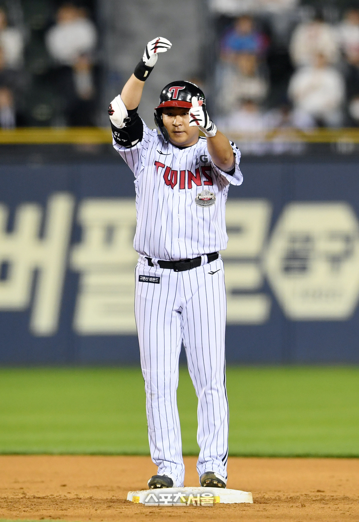 LG 트윈스 안익훈이 18일 잠실구장에서 열린 2024 KBO리그 롯데 자이언츠와 경기 4회말 무사 1루 상황에서 롯데 선발 박세웅을 상대로 2루타를 친 뒤 세리머니를 하고 있다. 2024. 4. 18. 잠실 | 박진업 기자 upandup@sportsseoul.com