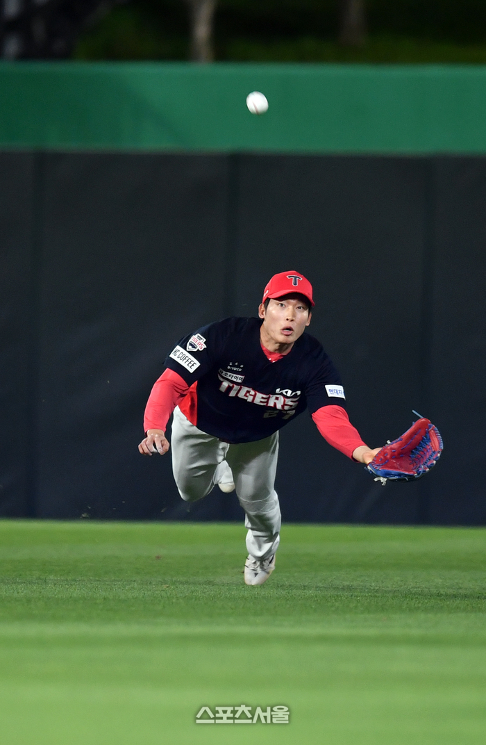KIA 중견수 김호령이 18일 인천SSG랜더스필드에서 열린 2024프로야구 SSG랜더스와 KIA타이거즈의 경기 6회말 1사 SSG 6번타자 박성한의 안타성 타구를 몸을 날려 걷어올리고 있다. 2024.04.18. 문학 | 강영조기자 kanjo@sportsseoul.com