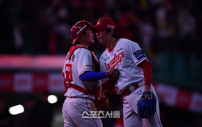 SSG 마무리 문승원이 18일 인천SSG랜더스필드에서 열린 2024프로야구 SSG랜더스와 KIA타이거즈의 경기 9회초 수비를 마친 후 이지영과 승리를 자축하고 있다. 2024.04.18. 문학 | 강영조기자 kanjo@sportsseoul.com