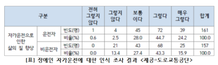 [스포츠서울ㅣ원주=김기원기자] 도로교통공단(이사장 직무대행 서범규)은 장애인의 이동성 제고 방안을 제시하기 위해 지체장애인을 중심으로 한 자가운전 지원방안 연구보고서를 발간했다. 연구보고서에 따르면 운전면허가 있는 지체장애인 400명을 대상으로 실시한 의견조사에서 64.2%는 ‘자가운전으로 삶의 질이 향상된다’고 응답했다.