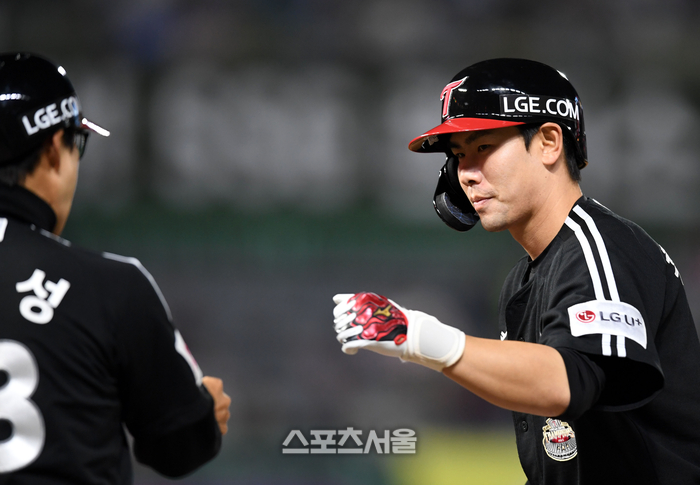 LG 홍창기가 19일 인천 SSG랜더스필드에서 열린 2024 KBO리그 SSG와 경기 7회초 1사1루 좌전안타를 친 후 정수성 코치와 하이파이브를 하고 있다. 2024. 4. 19. 문학 | 최승섭기자 thunder@sportsseoul.com