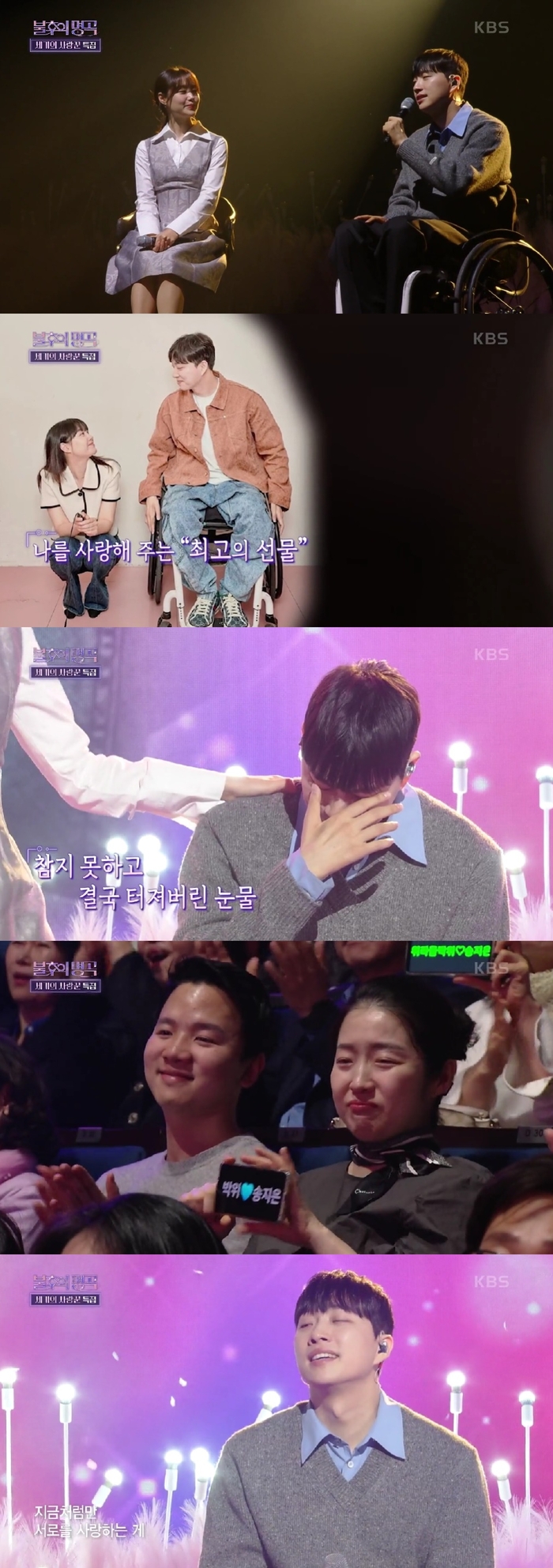 그 후 박위는 ‘위라클’이라는 채널을 통해 장애인으로 세상을 살아가는 모습을 가감 없이 공개했고, 어떠한 난관도 극복해내는 긍정과 희망의 아이콘으로 유명해졌다. 최근 송지은과 열애와 결혼을 알린 박위는 이날 함께 무대에 올라 가수 김동률의 ‘감사’를 열창했다.