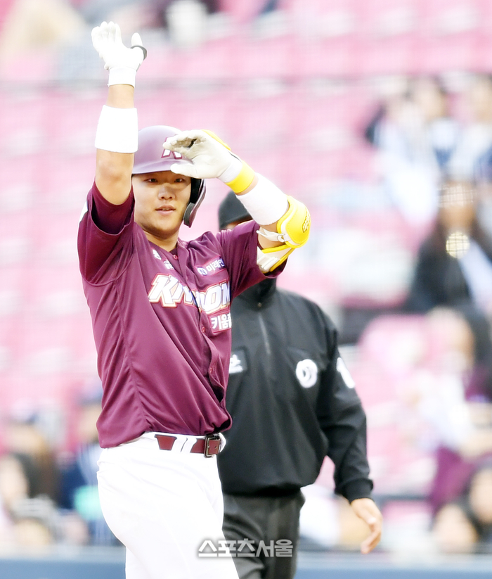 키움 8번타자 박성빈이 21일 잠실구장에서 열린 2024프로야구 두산베어스와 키움히어로즈의 더블헤더 2차전경기 3회초 1사 후 알칸타라를 상대로 자신의 첫안타를 뽑아낸 후 자축하고 있다.2024.04.21. 잠실 | 강영조기자 kanjo@sportsseoul.com