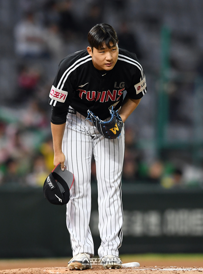 LG 트윈스 우강훈이 21일 인천 SSG랜더스필드에서 열린 2024 KBO리그 SSG 랜더스와 더블헤더 2차전 7회말 무사 자신의 투구에 손등을 맞은 SSG 김성현을 향해 모자를 벗어 사과하고 있다. 2024. 4. 21. 문학 | 박진업 기자 upandup@sportsseoul.com