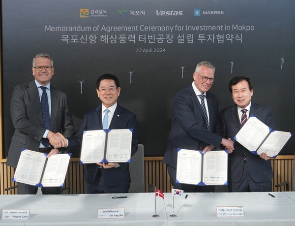 목포시 박홍률 시장은 지난 22일 덴마크 코펜하겐에서 베스타스 윈드 시스템스 A/S(이하 베스타스), A.P. 몰러-머스크 A/S(이하 머스크), 전라남도 김영록 도지사와 목포신항 내 해상풍력 터빈공장 설립 투자협약(MOA)를 체결했다고 23일 밝혔다.